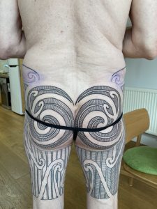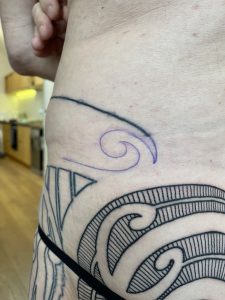 Korus to end designs coming around my hips from the front. The rest of the back will be blank.Koru detail